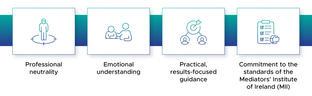 Our mediators are registered members of the Mediators' Institute of Ireland (MII) and work fully in line with the Mediation Act 2017, ensuring confidentiality, neutrality, and fairness throughout the process.